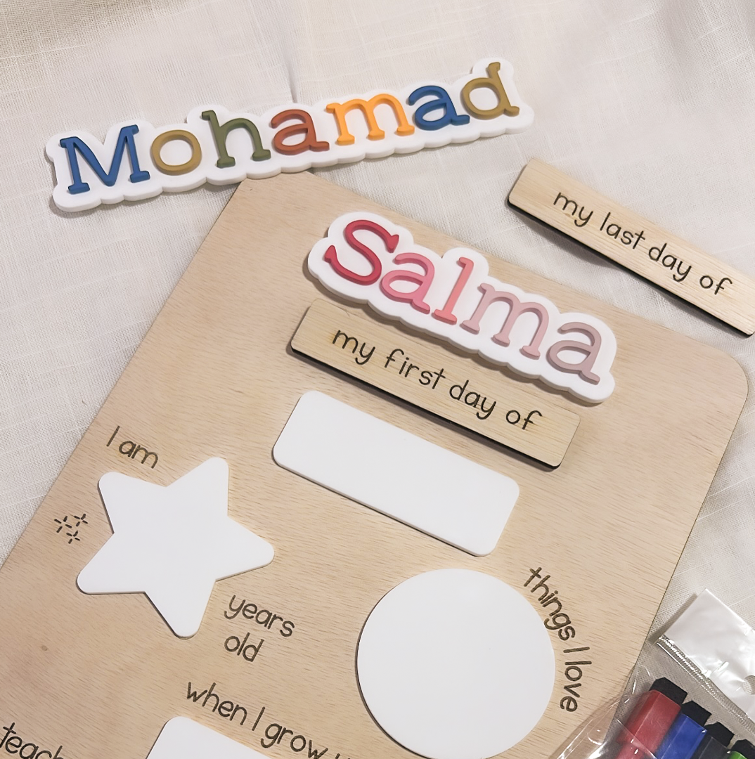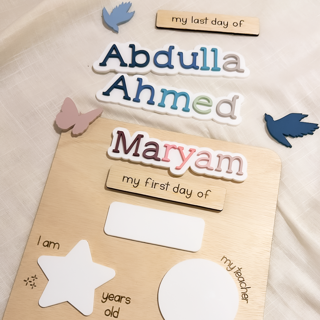 Fully customized with 3D, colorful names and shapes that can be easily changed for siblings and for both the first and last day of school.