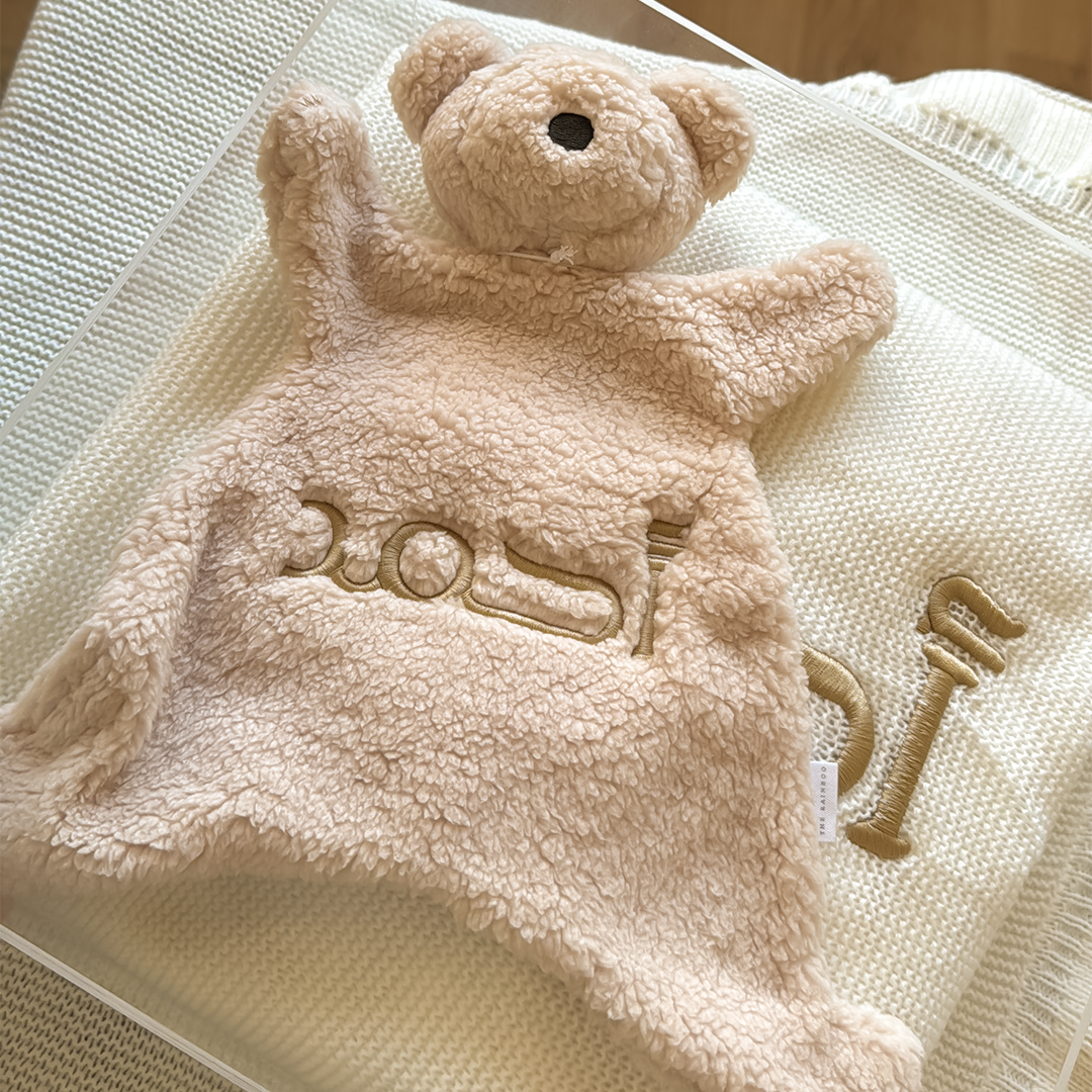 Available in brown and beige, beautifully embroidered with your baby’s name in your choice of color.